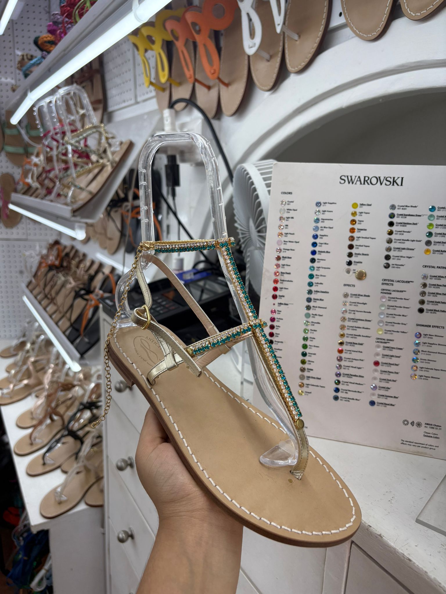 Il sandalo è impreziosito da cristalli incastonati uno ad uno con cura e precisione: una lavorazione meticolosa che dona luce, colore e unicità a ogni paio.