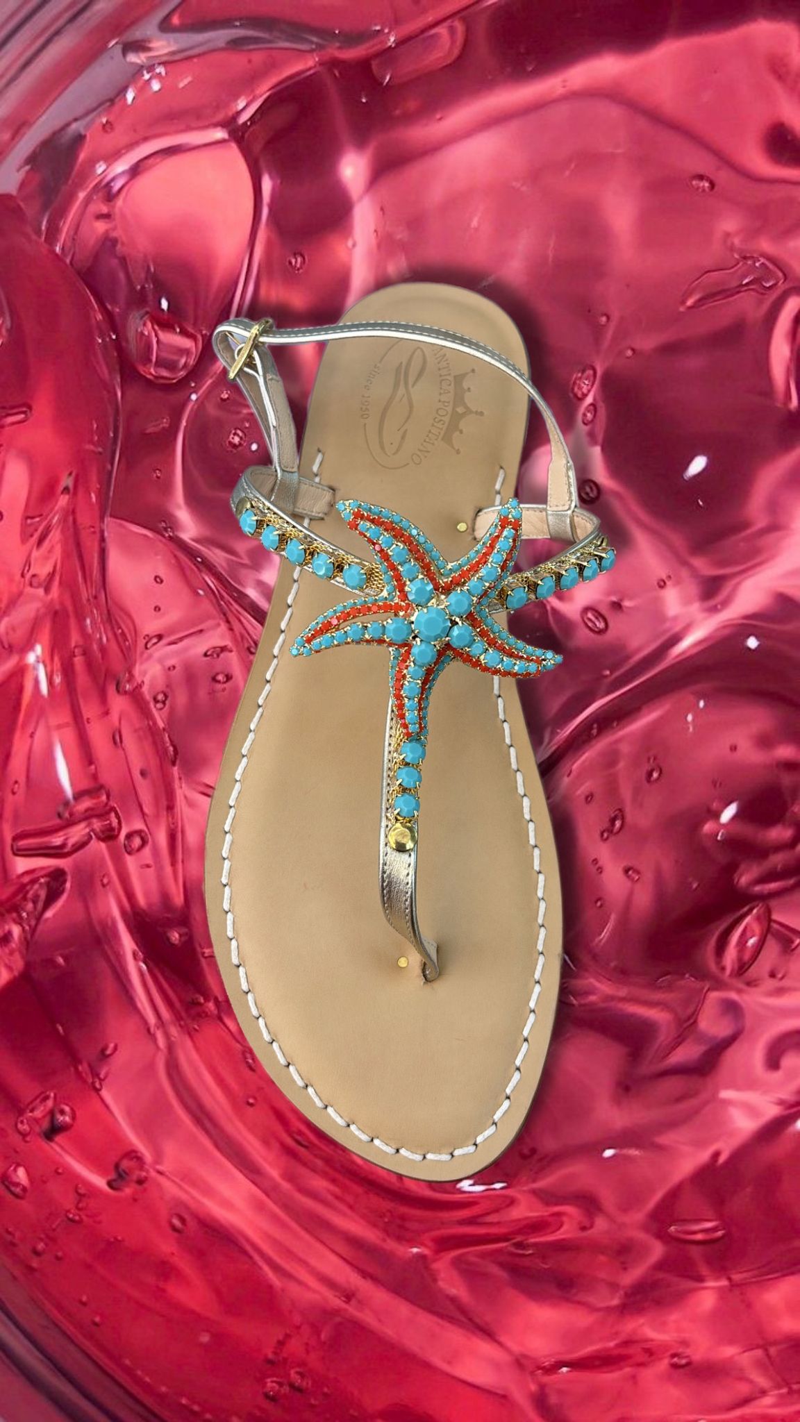 Vivace, elegante e profondamente mediterraneo: il Sandalo Stella Reale – Corallo è una vera esplosione di colori e stile. La stella marina centrale è decorata con cristalli turchesi e rossi, ispirati ai coralli del nostro mare e alle sfumature delle estati sulla Costiera Amalfitana.