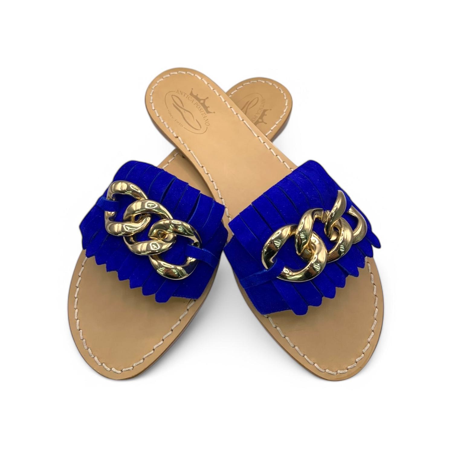 Deciso e sofisticato, il sandalo Vittoria è un omaggio all’eleganza italiana con un twist contemporaneo. La fascia in morbido velluto blu cobalto è arricchita da frange e maxi catena dorata, per un look che non passa inosservato.