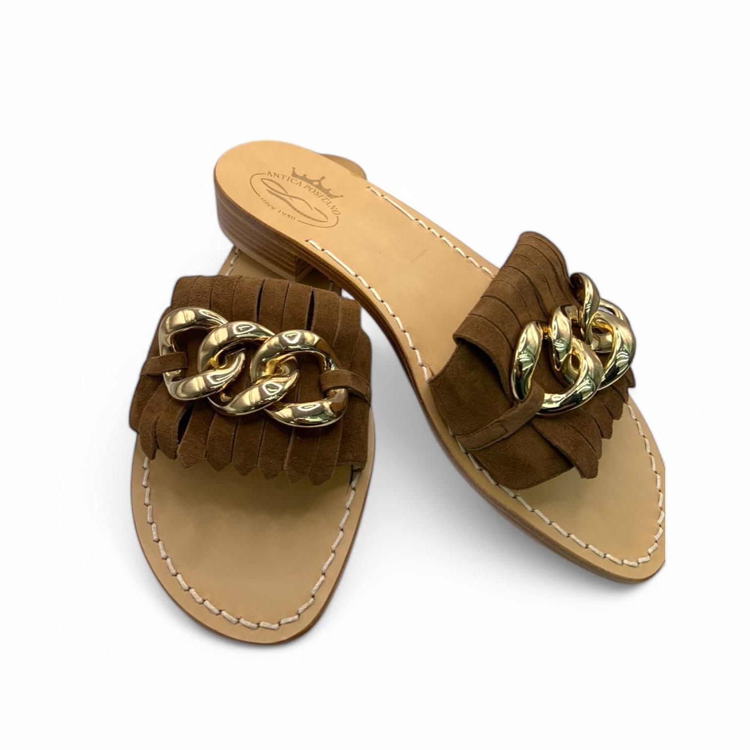 Deciso ma essenziale, il sandalo Vittoria Cuoio unisce la raffinatezza della pelle scamosciata marrone al carattere della maxi catena dorata. Un modello versatile e sofisticato, ideale per ogni momento della giornata.